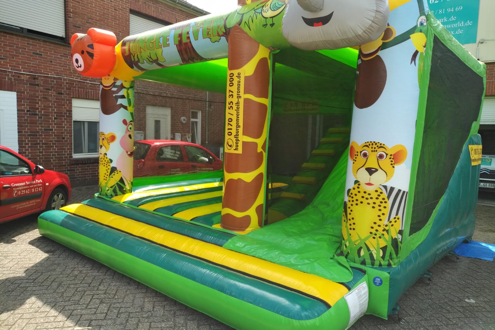 Unsere Jungel Fever Multiplay mit Dach Hüpfburg eignet sich ideal für alle Jungel Fans. Die Abbildung der Wilden Tiere und der Aufdruck machen diese Hüpfburg zu etwas Besonderem. Aufgrund ihrer großen Abmessung kann die Profi Hüpfburg z.B. für Firmen Events, Vereinsfeiern, Stadtfesten und Kinderfeste eingesetzt werden.